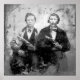 Frank James à esquerda e seu irmão Jesse posam com pistolas. Jovem, mas provou ser mortal. Feito no estilo impressionista digital e NÃO É UMA FOTOGRAFIA. Jesse Woodson James foi nascer em setembro de 1847 e morreu em abril de 1882 aos 34 anos. James lutou com Guerrilheiros Confederados durante a Guerra Civil e formou o famoso James Gang com seu irmão Frank depois, que roubou bancos e trens no médio-oeste. James foi ferido durante a guerra e durante assaltos a bancos, mas conseguiu protestar contra seus ferimentos. Ele foi citado como dizendo que nunca esteve longe de suas pistolas..E os mantinha na pessoa dele o tempo todo. James foi assassinado por Robert Ford, um membro de sua gangue de quem ele confiava. Ford estava negociando secretamente com o Governador do Missouri por uma recompensa para trazer o fora da lei.
