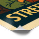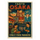 Retro poster de viagens de Osaka, no Japão, apresentando a viva rua Dotonbori à noite, cheia de sinais gigantes de neon (flautista fugitivo, caranguejo gigante, e Outdoor de glico). Pessoas que apreciam a comida da rua Osaka, como takoyaki e okonomiyaki, a partir de bancas, reflexões coloridas sobre a água do canal.