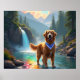 Um belo Ouro Retriever em uma floresta encantada vibrante e rio arco-íris.