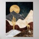 Um poster abstrato de deserto impressionante que apresenta uma silhueta de girafa ouro debaixo de uma lua ouro brilhante, com montanhas com textura de mármore em camadas, cacto do deserto, e um céu noturno estrelado a brilhar. A combinação de tons de terra, sotaques de ouro metálicos e detalhes celestes cria um poster moderno, místico e inspirado na boemia.
