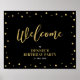 Este letreiro de boas-vindas elegante apresenta confetes texturizados dourados e tipografia moderna. Perfeito para aniversário chic & moderno, aniversário de casamento, ou festa de aposentadoria.