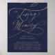 Este sinal de caligrafia em ouro romântico marinho em memória carinhosa é perfeito para um casamento simples. O design moderno clássico apresenta espirais sofisticadas e floreios caprichosos com tipografia de folha de ouro dourado falsa, elegante e manuscrita, sobre um fundo azul escuro.