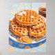 Um trabalho de arte digital de rega bucal com uma pilha de waffles ouros e crocantes encharcados em xarope rico e fluente e revestidos com manteiga cremosa. Os tons quentes dos waffles contrastam lindamente com o fundo floral azul suave, adicionando um toque aconchegante, mas elegante. Uma fatia de laranja fresco melhora a composição, fazer esta peça como uma celebração perfeita da indulgência do café da manhã e da artista comida.