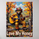 Este charmoso trabalho de arte apresenta um urso vestido de bombeiro, cheio de capacete e óculos de sol, tocando um violão acústico enquanto sentado numa cerca de madeira russa. As folhas coloridas do outono caem das árvores no fundo, e o chão está coberto de folhagem. A pintura usa pinceladas grossas, texturizadas, dando uma sensação caprichosa e entusiasmante, com "Love My Honey" escrito abaixo.
