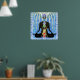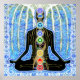 Beleza seu estúdio de yoga ou sala de meditação com essa visualização mostrando as chakras e a sushumna sobrepostas na silhueta de uma pessoa meditante, flutuando em uma radiância de pulsos azuis, turquesas e brancos de aura. Alta resolução, detalhes extremos, funciona em todos os tamanhos.