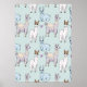 Um poster com um padrão bonito com lhamas brancas. Um está deitado, um está segurando uma flor na boca dele, e um está olhando para você desconfiadamente. Estes animais têm um grande caráter encantador. Colocado sobre um fundo de bolinhas verde.