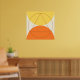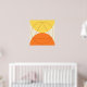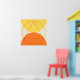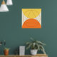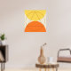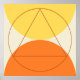 Uma design geométrica moderna de arte abstrato de círculos e triângulos em tons laranja e amarelo.