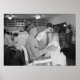 Vintage WW2 foto negra e branca de um sargento de Fort Benning cortando o cabelo do filho em um compro de barbeiro em Columbus, Georgia. Foto tirada em junho de 1941 pelo fotógrafo da FSA Jack Delano. Belo panorama dos anos 40 da dentro de uma barbearia antiga. Meio de origem: 35 mm de nitrato negativo.