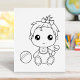 Bela menina de desenho animado vestida de macacão com uma bicicleta decorada com uma pequena estrela. A bola de brinquedo está descansando ao lado. Feita para uma coloração fácil.