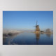 Poster de uma paisagem no campo dos Países Baixos no inverno, com um moinho de vento, gelo no rio e foscos de areia sob um céu azul claro.