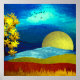 Um belo design de paisagem abstrato com um céu único que se assemelha a ondulações em líquido e uma lua, montanhas e uma árvore ouro.