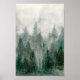 Impressão de pinheiro de floresta com neblina de aquarelas. Arte da paisagem montanhosa. Pintura da natureza design de árvores verdes e nebulosas. Decoração moderna do lar.