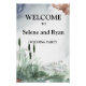 Um poster de boas-vindas brilhante para um casamento, mostrando uma paisagem ao lado do lago com vegetação típica e cisnes. A design capta a beleza serena do cenário ao lado do lago, criando um ambiente convidativo para os hóspedes ao entrarem na celebração