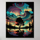 Paisagem laca com silhuetas de árvores e céus de nuvens psicodélicas.
