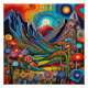 A I.A. criou a interpretação de uma paisagem brilhante e vibrante surreal, psicodélica, apresenta colinas rolantes, montanhas e padrões circulares abstrato representando flores.