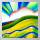 Design de paisagem com aquarela digital em cores e texturas vibrantes do arco-íris com um nascer do sol e raios solares salientes.