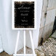Uma poster de boas-vindas para um casamento. Um fundo na moda preto decorado com faxes de brilho dourado. Personalize e adicione seus nomes e a data do casamento. Cartas brancas.