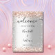 Uma poster de boas-vindas para um casamento. Um fundo na moda de aparência prateada decorado com um confete de ouro rosa. Personalize e adicione seus nomes e a data do casamento. Letras negras.