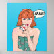 Uma mulher ruiva jogando pôquer. Ela está segurando todos os ases. Shhh! Um design de retrô, estilo pop.