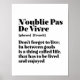 Não se esqueça de viver, Pas De Vivre. O inspirador e motivacional francês cita design para aqueles que amam a bela e romântica língua francesa. Legal mercadoria com estilo de definição de dicionário misturada com sarcasmo e humor leve. Quem diz que não pode ser engraçado, chique e legal enquanto inspira os outros com essas palavras perspicazes e discursos de vida. Excelente souvenir, presente de Natal e aniversário para aqueles que sonham em viajar para Paris e se apaixonarem pela Torre Eiffel.
