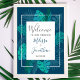 Bem-vindos aos seus convidados de casamento com esta bela e moderna poster botânica verde-azul, decorada com folhagem e palmeiras selvagens. Um adorável sinal tropical adicionado a uma cerimônia de verão ao ar livre ou a um casamento de destino ilha em uma praia havaiana.