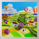 As cores fortes aparecem nesta cena balbuciosa. Esta pintura a óleo na canvas esticada é pintada no popular estilo de arte ingênua/popular. Crianças voam com suas pipas no campo perto de suas casas rurais. Uma paisagem rural colorida com balões de ar quente e o mar visível ao fundo.