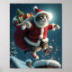 Adicione um toque de magia de férias à sua coleção com esta trabalho de arte caprichosa e ultra realista de um adorável gato de mesa vestido de Papai Noel. O felino festivo sobe através do céu noturno nevado, saltando graciosamente sobre uma chaminé enquanto carregando um saco grande e transbordante de presentes de Natal lindamente envoltos. Vestido em um terno clássico de Papais noeis vermelhos, com um chapéu branco de pelo, um chapéu de Papai Noel fofo e tênis na moda, o gato expele encanto e alegria festiva. Ouro mágico brilha atrás, e a lua brilhante de cheio ilumina os telhados de neve abaixo. Perfeito para cartões de Natal, decorações ou presentes para amantes de gatos e entusiastas de férias, esta imagem captura a diversão e a maravilha da temporada