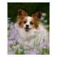Um cão de White e Red Papillon sentado num prado cercado por Cuckooflower. O Papillon é uma raça de brinquedo muito inteligente, amistosa e inteligente. Este cãozinho adorável foi fotografado por Katho Menden, esta foto de animal em um poster é uma ideia especial encantadora de presente para doglovers.