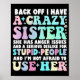 As Irmãs Engraçadas Citam design: De Volta Tenho Uma Irmã Louca Que Ela Tem Problemas De Raiva E Um Desgosto Sério Por Pessoas Estúpidas E Não Tenho Medo De Usá-La. Um telhado maravilhoso com um discurso maravilhoso, pode fazer um excelente presente para a irmã do meio, mais nova e mais velha, o melhor arranjo familiar para irmãs malucas. Roupa de sarcástico perfeito para a meia-irmã, cunhada, amiga, colega, filha, sobrinha... no aniversário, dia de as mães, dia de os pais, dia de os namorados...