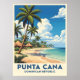 Uma cena serena de praia tropical em Punta Cana, República Dominicana, com palmeiras, cabanas de telhado e um oceano calmo sob um céu azul.