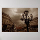 Um tom sépia inspirou uma imagem com uma típica arquitetura francesa nos lados esquerdo e direito da imagem, com trânsito circulando ao redor da ópera de Paris, a Ópera Natinale de Paris na Place de l'Opera neste 9º arrondismo. Os tons vermelhos do caminhão retrorreflector podem ser vistos viajando pela interseção. O clássico icônico farol de rua é destacado no primeiro plano da imagem