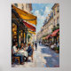 Esta pintura impressionista captura a atmosfera viva de uma rua europeia, provavelmente em Paris, com vários cafés ao ar livre e pedestres arrebatadores. O estilo é muito texturizado com pinceladas grossas e visíveis, dando uma sensação dinâmica às árvores, edifícios e pessoas. Uma árvore proeminente no primeiro plano lança luz do sol sobre a cena, iluminando as cores quentes das fachadas do prédio e os avisos vermelhos e beges. A pintura evoca uma visão clássica e romantizada da vida urbana e do lazer.
