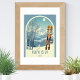 Poster from a wonderful ski resort holiday in the beautiful mountains of Park City, Utah! This small poster features an arch with a stunning blue-grey mountain landscape and retro ski boards in an orange tribal pattern in the foreground. The rest is in a lovely light blue tone with the location lettering in a modern font. The design is a lovely combination of retro and modern, and I hope you enjoy it!
