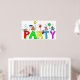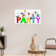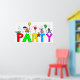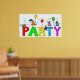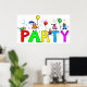 Um grupo feliz e diversificado de crianças subindo sobre a palavra FESTA.
