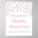 Poster de festa de retirada de texto personalizado com um confete prateado e rosa.