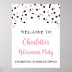 Poster de festa de retirada de texto personalizado com confete preto e rosa.