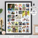 Crie um poster de memórias de fotos para um formando ou uma festa de formatura de memórias de fotos usando este modelo de colagem de fotos com 35 fotos quadradas do seu formando ao longo dos anos. O design apresenta um FORMANDO de título de tipografia design com letra de pincel moderna, com letra de mão, com ano de aula e boné de formatura ou prancheta em preto e ouro contra um fundo branco editável. Faça várias exibições em toda a festa e considere temas para cada um como Família, Amigos, Esportes, Interesses e Hobbies, etc. O tamanho de 16x20 mostrado é um tamanho de quadro popular e comum para uma peça de arte comemorativa na parede de manutenção para o formando, pais e avós também. ASSISTÊNCIA: para obter ajuda com a modificação/personalização do design, alteração de cor, transferência do design para outro produto ou, se você quiser coordenar itens, entre em contato com o designer ANTES DE ENCOMENDAR através da guia MENSAGEM de bate-papo Zazzle ou por e-mail em makeitaboutyoustore@gmail.com.