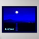 Moonrise na passagem de Dentro do casaco do Alasca. Montanhas à distância e um barco de pesca dirige-se para norte. A leitura de texto "Alaska" aparece em azul e branco brilhantes.