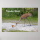 Foto de dois guindastes-sanduíches, uma ave-mãe e um pássaro-bebê, com a grua-mãe alimentando seu bebê com um inseto. Esta foto do guindaste foi tirada quando o pássaro bebê tinha apenas dois dias. A mãe e o filhote de pássaros estão em pé num caminho de cascalho com grama e arbustos no fundo. Uma fotografia encantadora da natureza de uma ave-mãe alimentando um pássaro bebê.