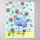 Pintor aquoso de um pássaro azul giro cercado por bonito flores rosa e folhas verdes.