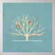 Poster com um fundo verde mudo sobre a parte superior é uma árvore amarela clara com 2 silhuetas de pássaros laranja sentados nos galhos.