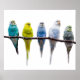 Fileira de cinco aves orçamentárias, ou periquitos, em um galho