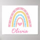 Este é um poster boho arco-íris personalizado fofo. Ele foi projetado cor-de-rosa, azul e laranja pastel com pequenos corações e grande coração rosa no meio com nome personalizado para o berçário de menina ou quarto de criança