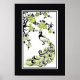 O pavão preto, verde e cereja floresce um design personalizado, com uma silhueta verde limão preta de um pássaro de pavão e um galho de cereja - sakura - com flores adoráveis com efeito de textura esmagada em fundo branco e uma borda preta ao seu redor. Um elegante design modelo floral com um talento asiático oriental. Este design feminino é totalmente personalizável.
