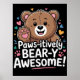 Esta ilustração carinhosa mostra um encantador urso marrom agitando entusiasticamente com uma pata, revelando uma pata rosa e fofa. O rosto do urso está se comportando com um sorriso largo e feliz, cercado por uma dispersão de corações coloridos em rosa, azul, laranja e amarelo, acrescentando ao seu doce comportamento. Abaixo do urso, a frase brincalhona "Paws-itively BEAR-Y AWESOME!" é escrita em uma fonte branca, enfatizada por minúsculos sotaques impressos em pata. O design geral irradia a beleza, a felicidade, e uma sensação de positividade entusiasmante, perfeita para trazer um sorriso à face de qualquer um.