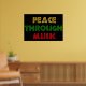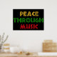 Letras amarelas, verdes e vermelhas soletram "Paz Através da Música". Mensagem antiguerra excelente para se espalhar na língua universal que é a música. Afinal de contas, foi o Rock and Roll que derrubou o muro e não políticos mesquinhos.