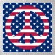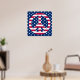 Sinal de paz listrado vermelho e branco sobre fundo azul com estrelas brancas.