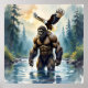 Poster. Um Sasquatch muscular com uma águia pousando em seu ombro enquanto ele percorre um rio em uma floresta.