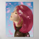Um trabalho de arte de Bloom Pacífico. Ela apresenta uma serena com cabelo rosado suave fluindo suavemente na brisa, cercado por flores delicadas. Perfeito para quartos, estúdios ou qualquer espaço que possa usar um toque de suavidade e luz.