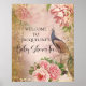 Um elegante sinal de boas-vindas ao Chá de fraldas que é personalizado com o nome da sua futura mãe. Vintage elegante Os pavões foram pintados em aquarela e misturados com elegantes florais de pénia rosa-pincel, rolhas de ouro e espirais e colididos com sutis elementos da epemera. Esta colagem foi projetada graficamente por uma artista e designer internacionalmente licenciada, Audrey Jeanne Roberts, copyright.